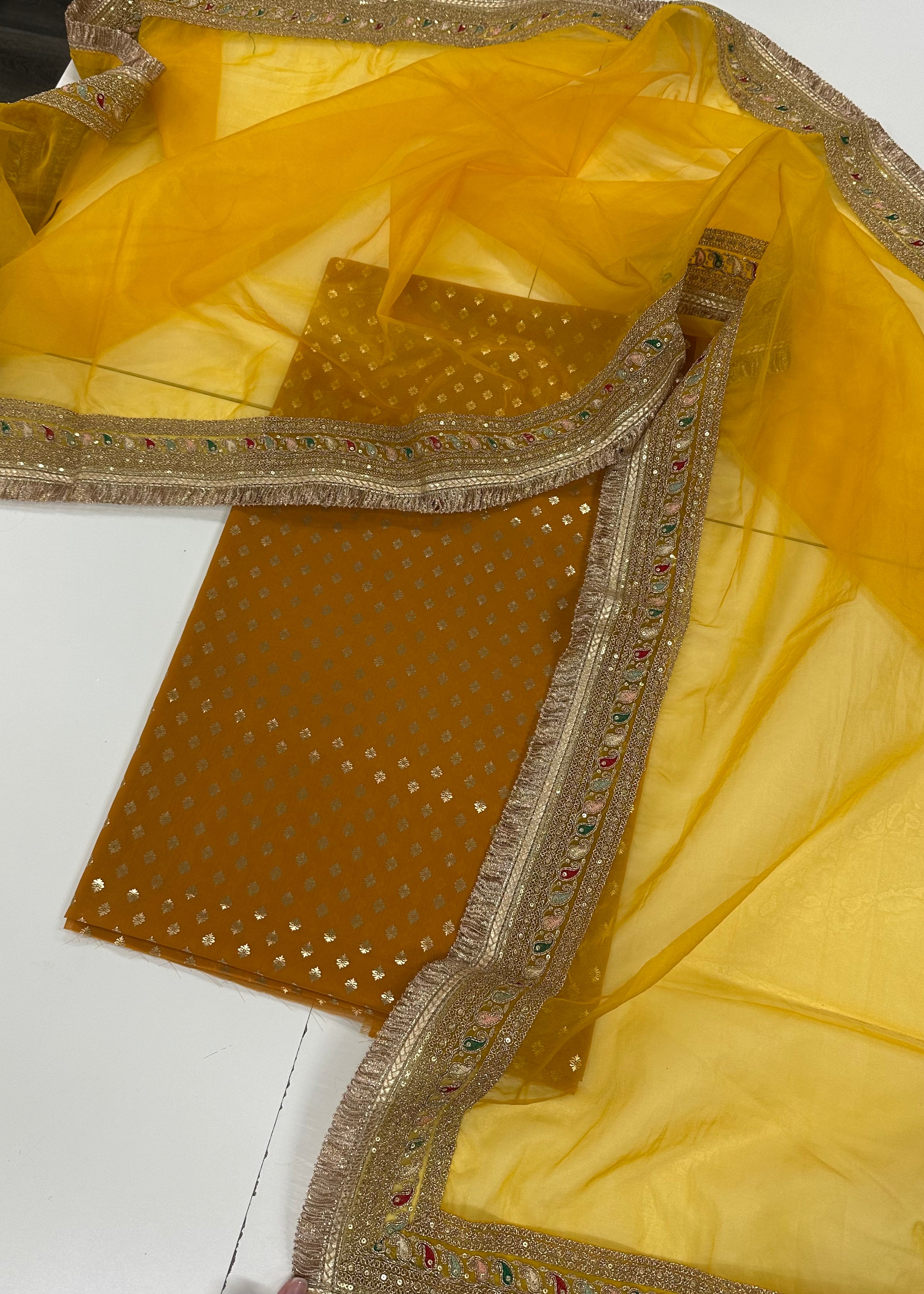 5 meter foil print unstitch Suit paired with a organza dupatta